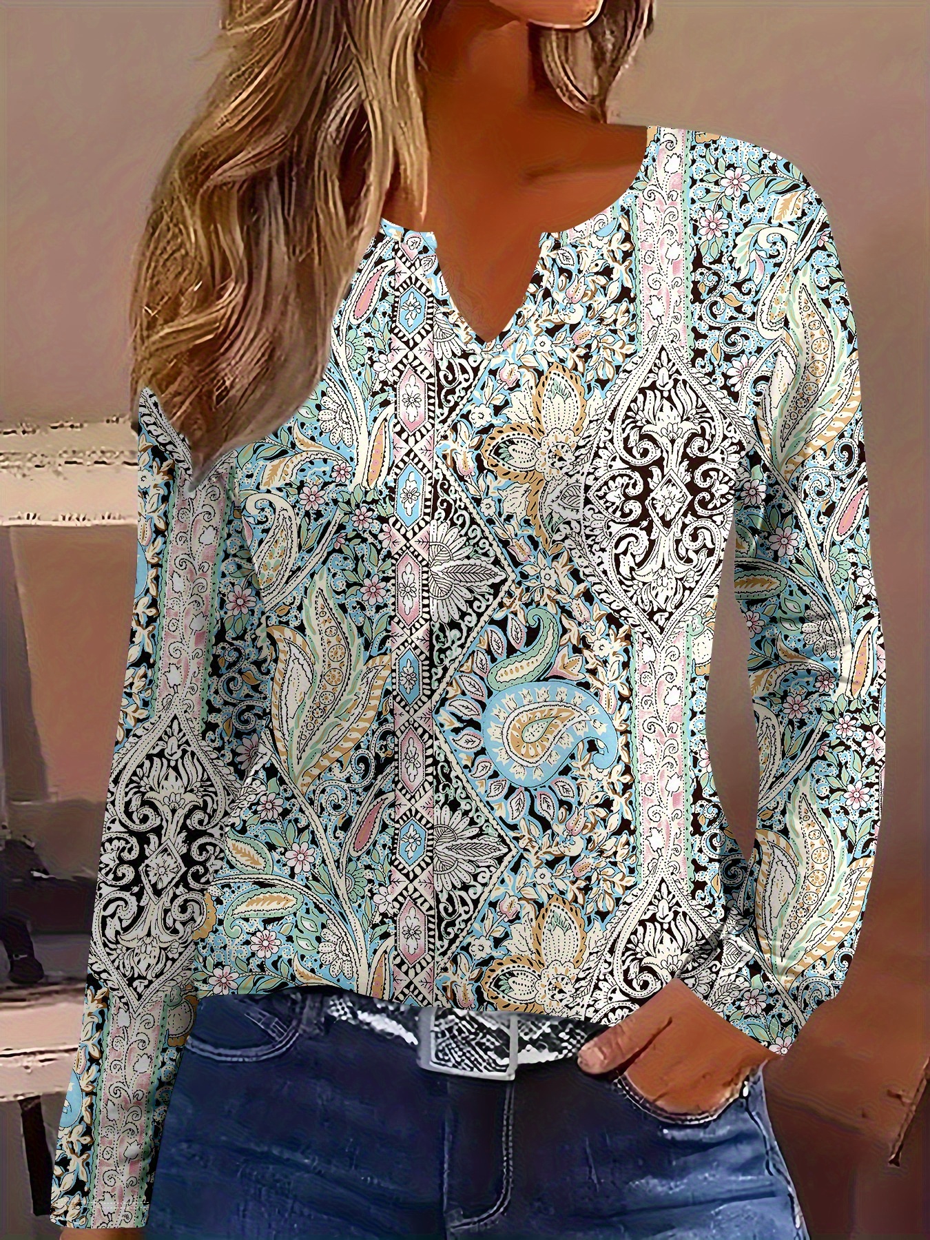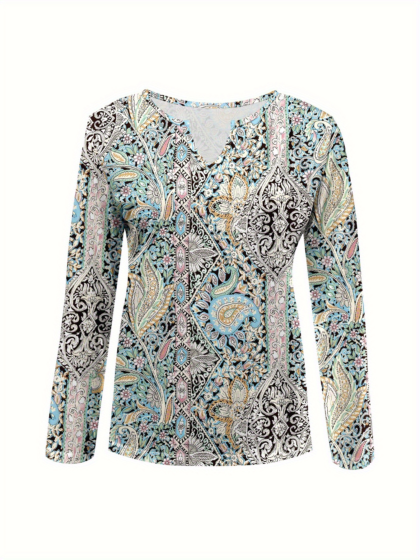 Plus Size, Plus Size Women's Elegant V-Neck Long Sleeve T-Shirt - All-Over Floral Print, Stretchy Mid-Weight Fabric, Machine Washable, Autumn Winter Casual & Formal Tops