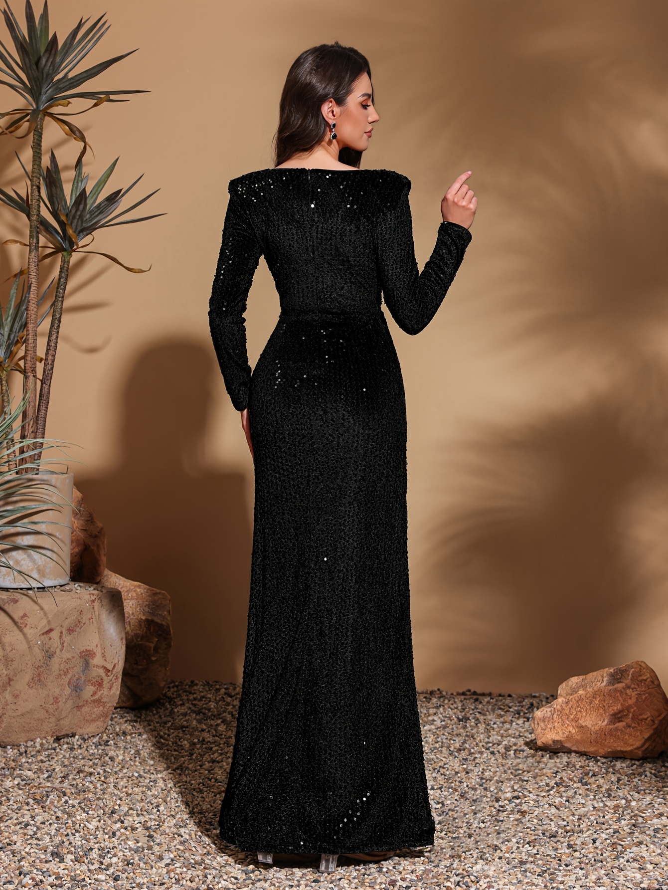 [Sequin Elegant Dress] Sequin Elegant Black Long-Sleeve V-Neck Plus Size Dress | Polyester Blend, High Slit, Perfect for Parties, Birthdays, and Formal Events, Adult Women's Fashion, Event Dress