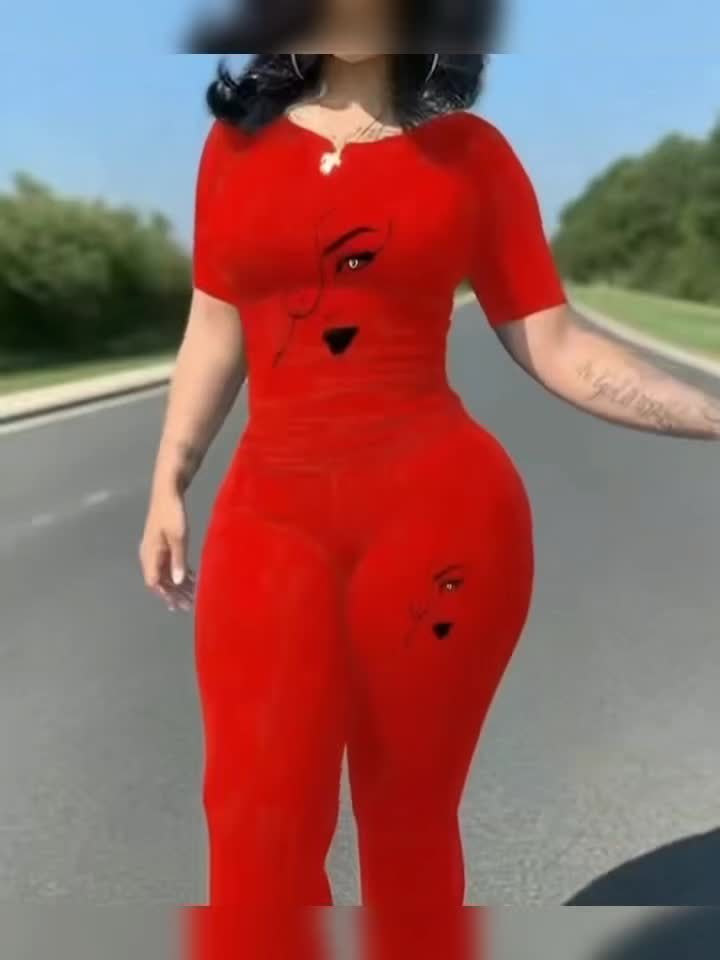 XDCH12LA10 European and American Women's Casual Sporty Round Neck Loose Short Sleeve Long Pants Set with Unique Print Two-Piece Outfit