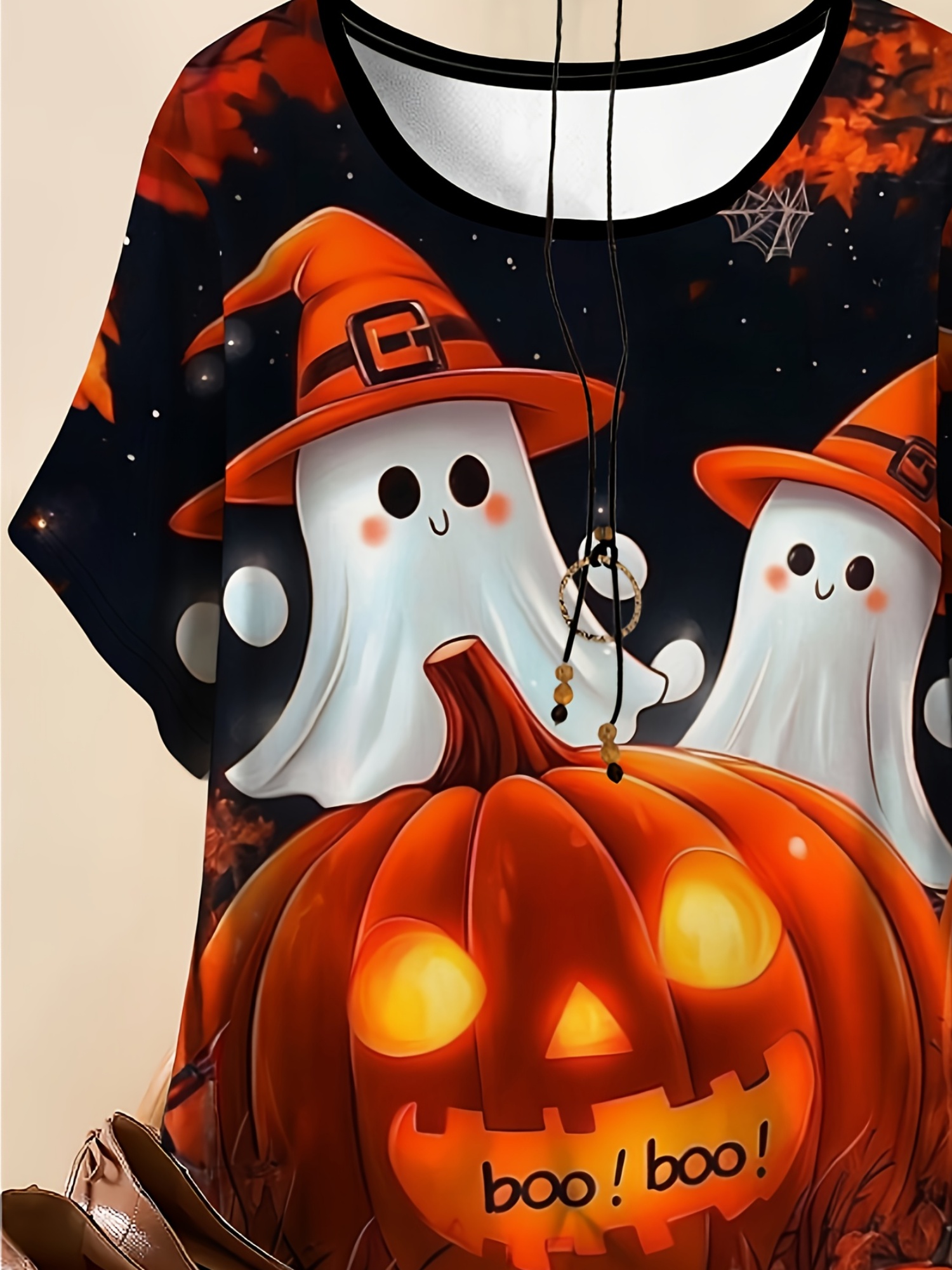 Plus Size - Plus Size Women'S Halloween Graphic Tee - 3D Witch Hat & Pumpkin Design, Soft Breathable Fabric, Round Neck Short Sleeve Top, Machine Washable, Casual Fall & Winter Wear, Perfect Halloween Gift, Halloween Costume