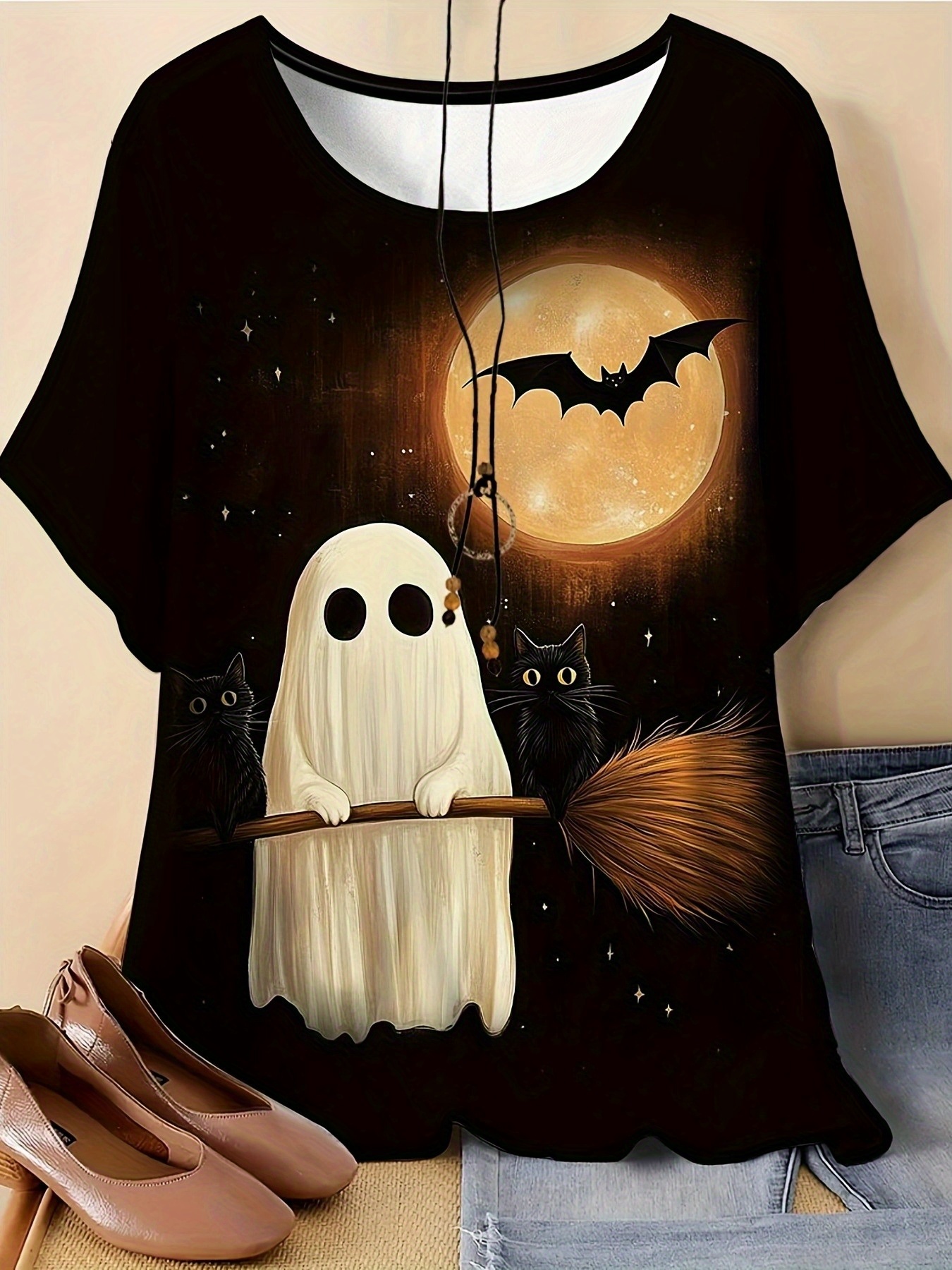 [Halloween Shirts] Plus Size Women's Halloween T-Shirt - Spooky Ghost, Bats & Full Moon Print, Stretchy Round Neck Short Sleeve Top | Casual Summer Outdoor Wear, Elegant & Comfortable Fabric