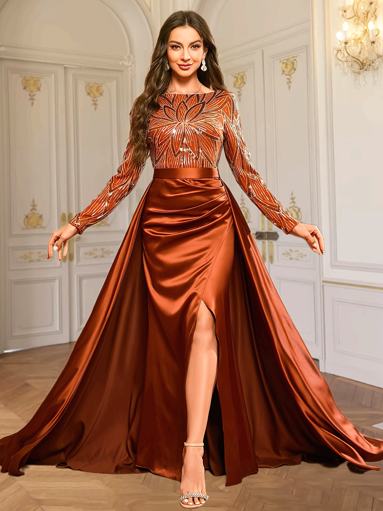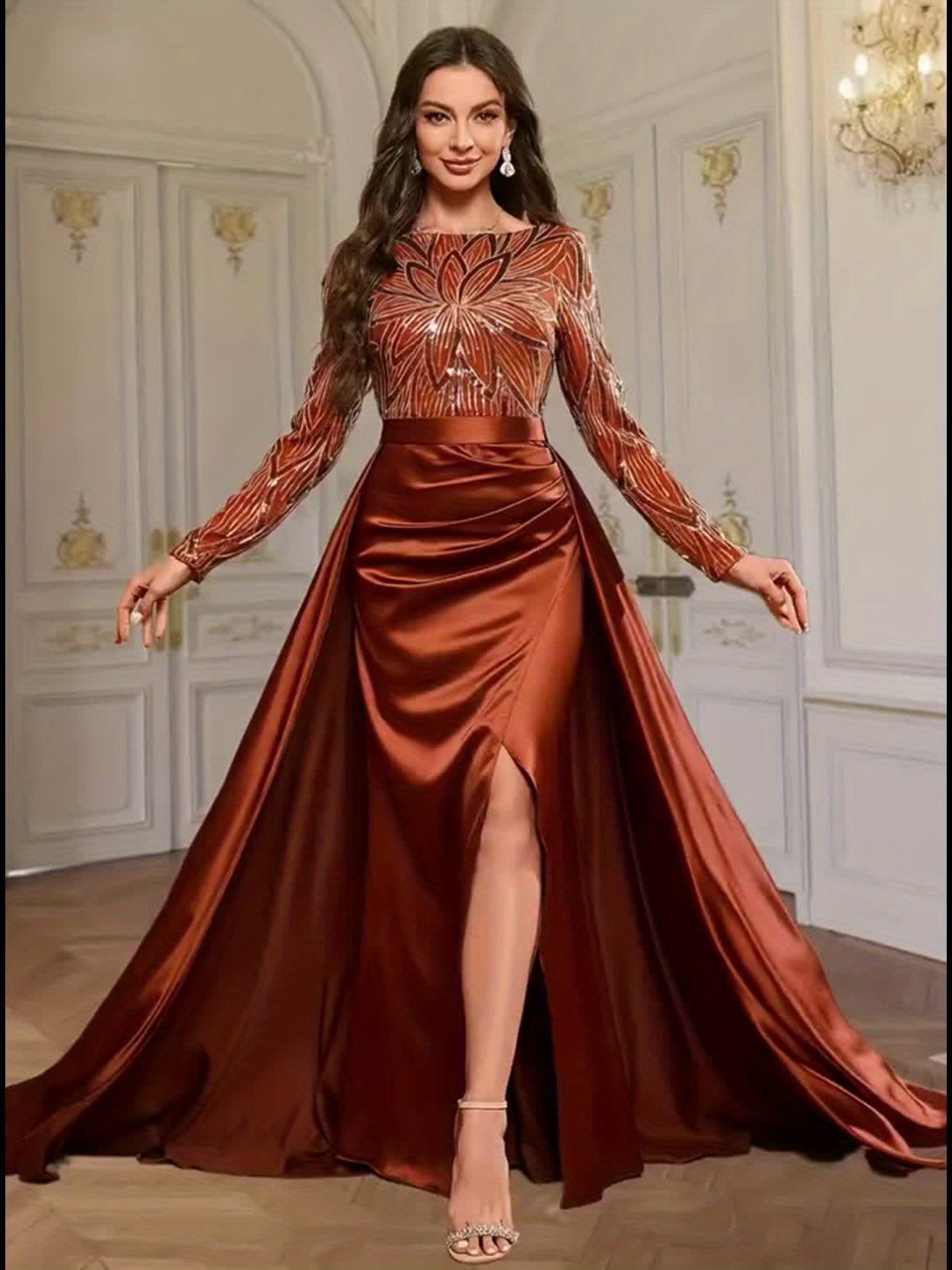[Sequin A-Line Dress] Sequin Elegant Long Sleeve A-Line Dress | Crew Neck, Solid Color, Fitted, with Contrast Sequin Details | for Adult Women, Spring/Summer, Evening Wear