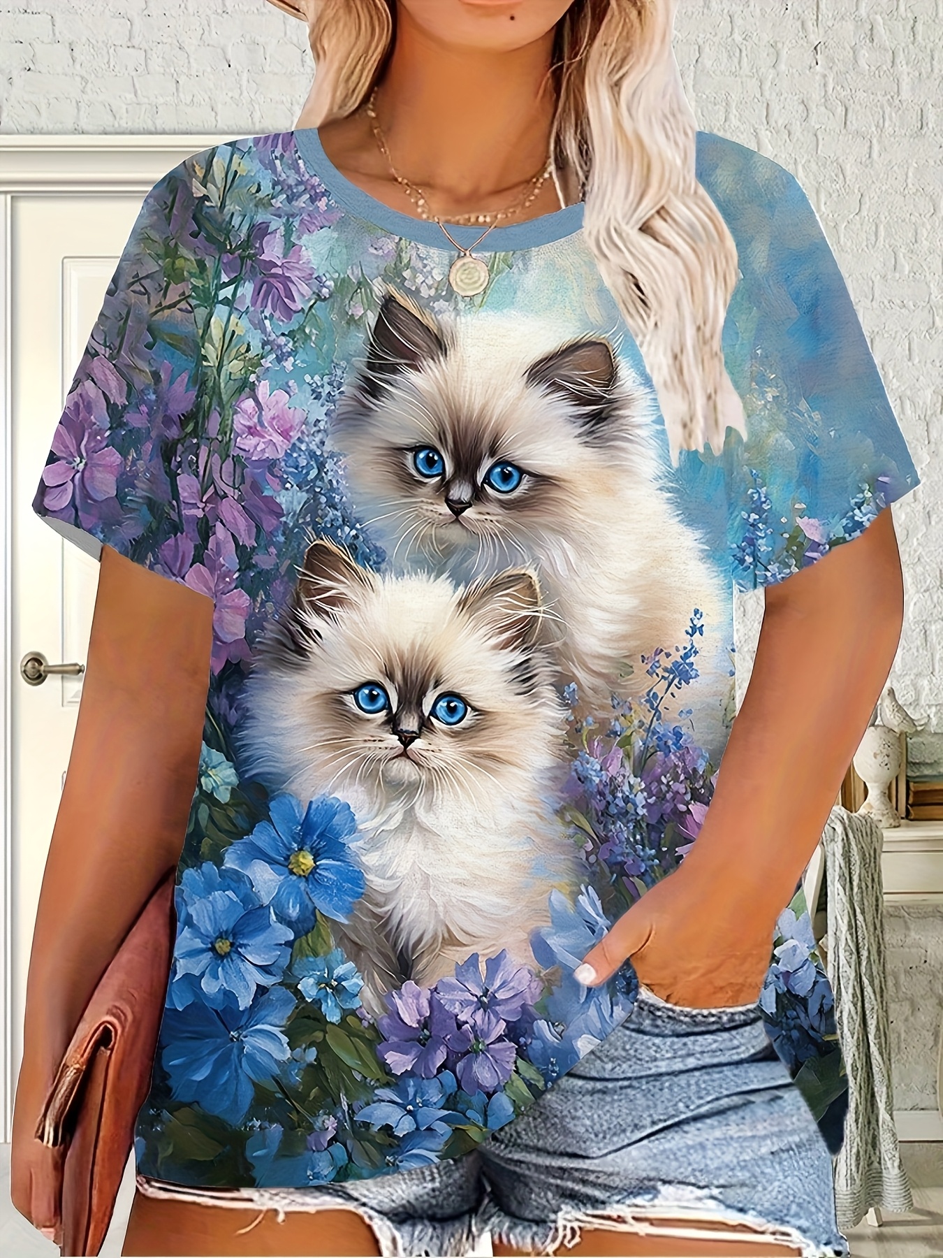 [Plus Size Floral Cat T-Shirt] Plus Size Women's 3D Floral & Cat Print T-Shirt - Stretchy Round Neck Short Sleeve Summer Top, Machine Washable Casual Elegant Outdoor Wear