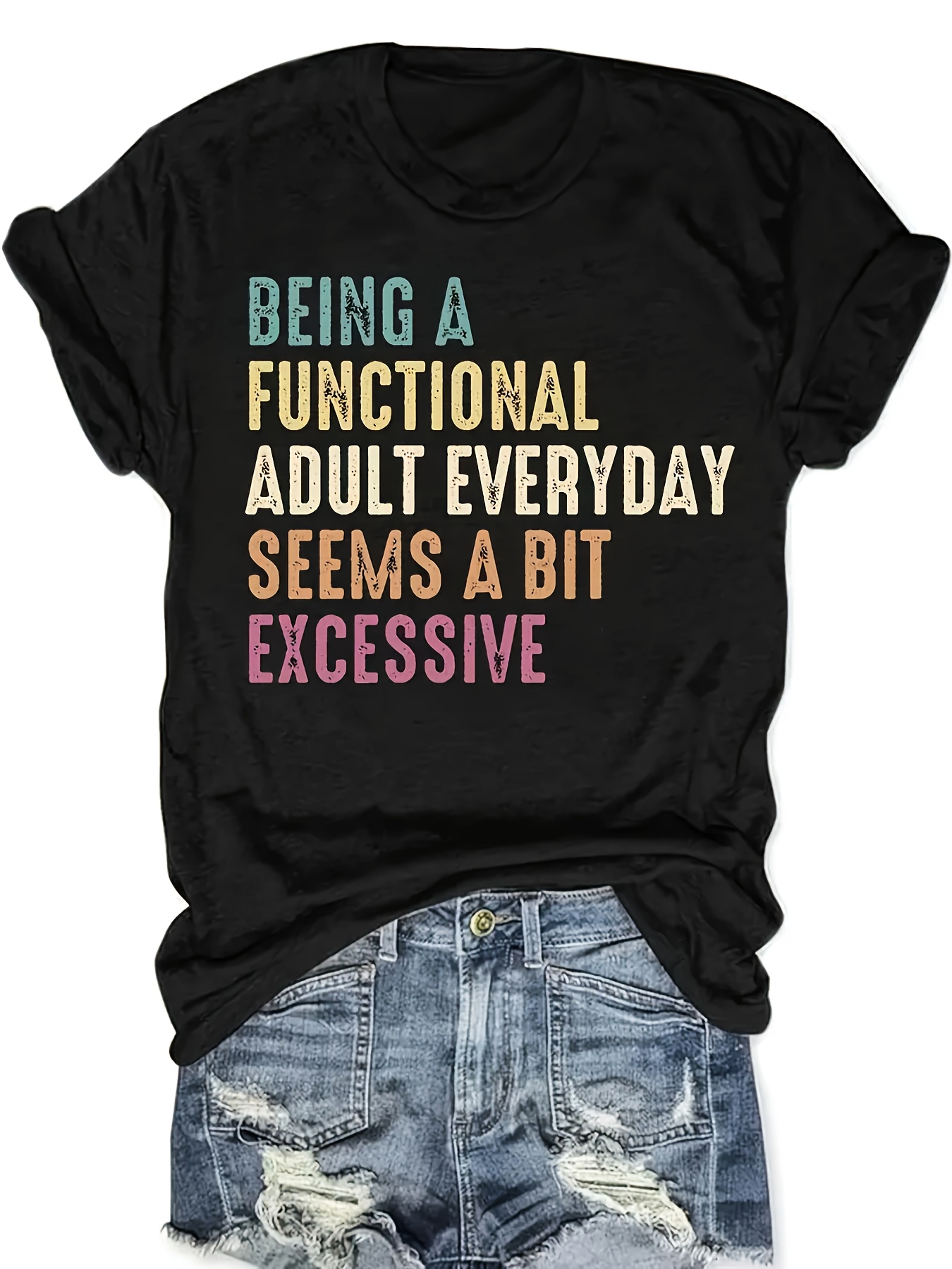 Women's Casual Short Sleeve T-Shirt - Black Relaxed Fit Round Neck with Colorful Geometric Print & Humorous Slogan, Machine Washable Summer Top for Casual Attire, Ladies T Shirts, Comfortable Tee