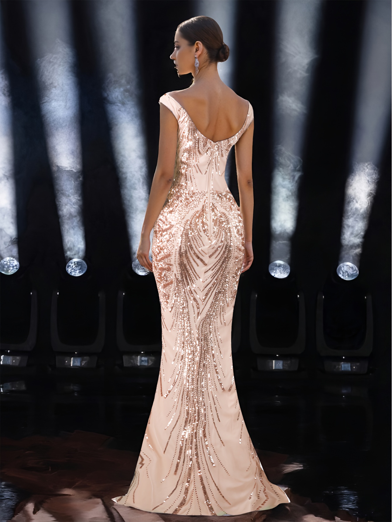 Exquisite Elegant U-Neck Waist-Cinched Fishtail Dress with Beaded Rhinestone Embellishments – Glamorous Evening Gown for Banquets, Awards Ceremonies, Weddings, and Graduation Parties