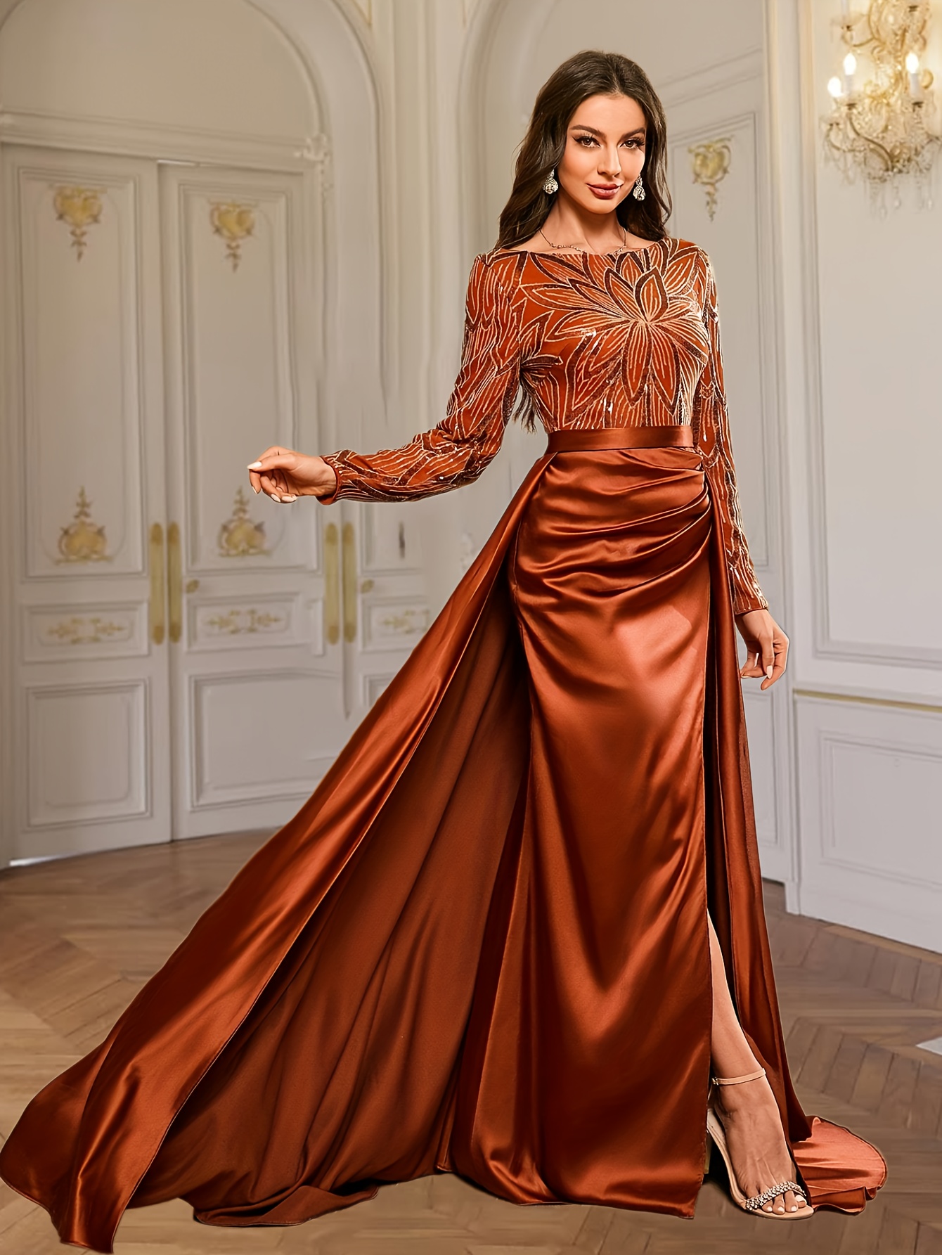 [Sequin A-Line Dress] Sequin Elegant Long Sleeve A-Line Dress | Crew Neck, Solid Color, Fitted, with Contrast Sequin Details | for Adult Women, Spring/Summer, Evening Wear